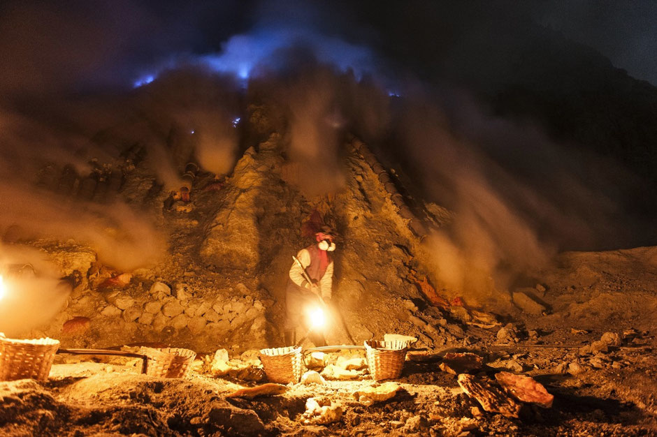 There is a volcano, south of the island of Java, called Ijen. During the 1960’s the first miners installed metal tubes into its crater to extract the sulphur. Having reached the bottom of the crater, they fight the volcano with a metal lance to draw its blood; they break up large chunks of sulphur in extreme conditions, with temperatures reaching 200 degrees centigrade, amid toxic fumes. The sulphuric gasses burn their lungs, skin and eyes. You can hear them coughing, staggering in the toxic cloud. They work with no kind of protection: the luckiest wear rubber boots, but most only sandals, they hold a wet rag over their mouth in order to breathe among the toxic gas, for the little protection a rag can offer. “We work in hell” say the miners “our eyes and lungs burn all day long, but there is nothing we can do, without this job we cannot afford food, we cannot support our families, we cannot send our children to school. We do this job because we don’t want our children to have to do it too one day.”