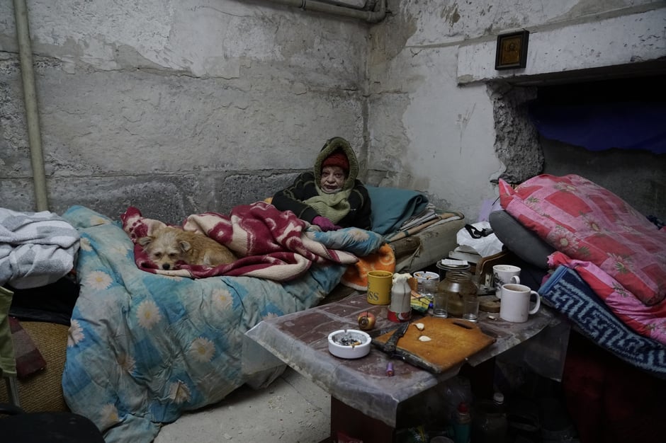 We were walking around Horenka, one of the neighborhoods, on the outskirts of Kyiv, most destroyed by Russian bombing, when we heard voices coming out of a basement. Upon entering we found a few people, and an elderly woman who had been living in this basement for eight months now to protect herself from the Russian shelling, without water, light or heat.